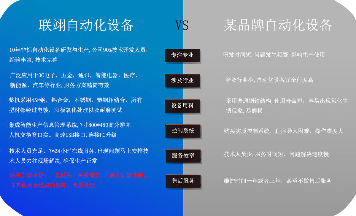 聯(lián)翊專(zhuān)注于助力企業(yè)邁向自動(dòng)化,減少人工成本,增加生產(chǎn)能力,提升行業(yè)競(jìng)爭(zhēng)優(yōu)勢(shì),從方案→設(shè)備→售后,一站式設(shè)備服務(wù)提供商,選擇聯(lián)翊,終身無(wú)憂(yōu)。